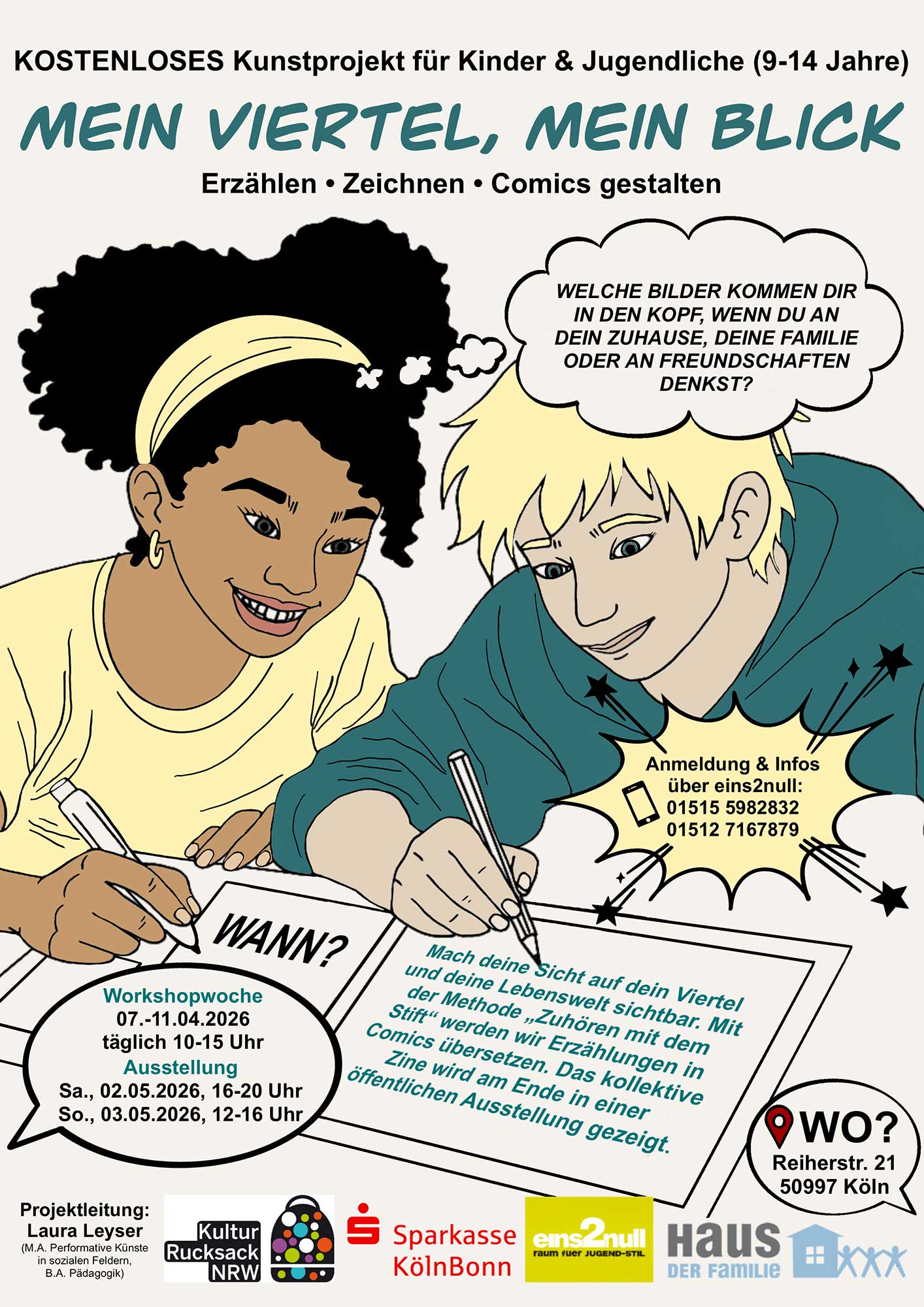Projekt „Mein Viertel, mein Blick“, ein Workshop in den Osterferien vom 07.-11.04.26, Ausstellung am 02.05.26 und am 03.05.26 bei uns im «eins2null» im «Haus der Familie», Rondorf, Reiherstraße 21.