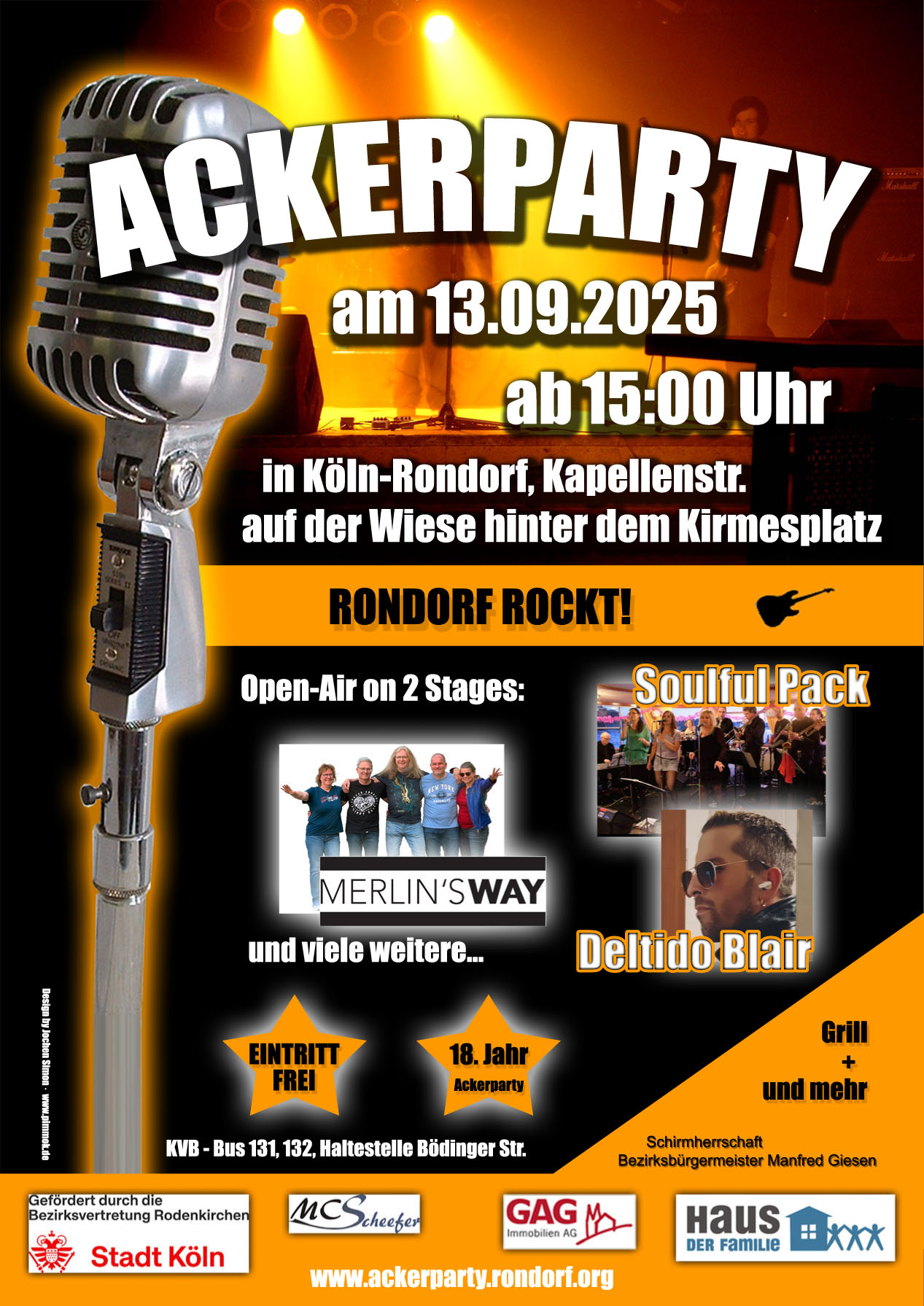 Ein Musikfestival für Bands, die aus dem Kölner Süden bzw. aus den umliegenden Ortsteilen kommen und mindestens 30 Minuten lang ein Publikum begeistern können. Rahmenprogramm vom eins2null: Kinderschminken, Hüpfburg, Volleyball. Die nächste Ackerparty findet am 12.09.2026 statt. Und es gibt ein Ackerparty-Video, zu sehen auf Youtube . Der Flyer zur Veranstaltung