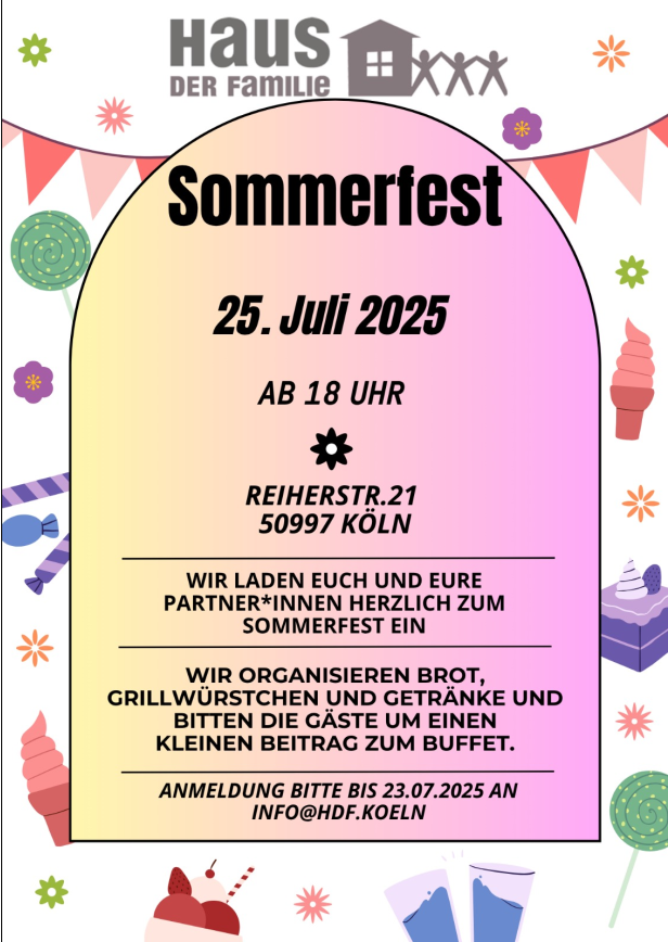 Wir organisieren Brot, Grillwürstchen und Getränke und bitten die Gäste um einen kleinen Beitrag zum Buffet, Anmeldung bitte bis 23.07.2025 an Der Flyer zum Download -